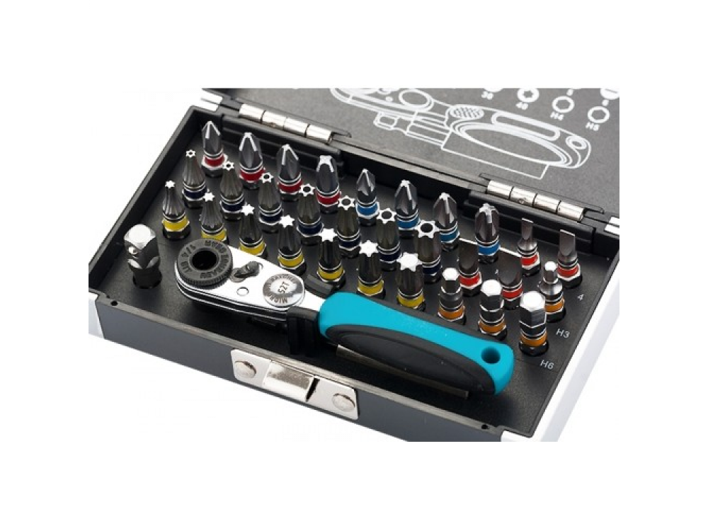 Набор бит и торцевых головок торговой марки GROSS предназначен для монтажа/демонтажа резьбовых соединений при проведении слесарно-монтажных работ. В наборе 30 бит, изготовленных из высококачественной инструментальной стали S2, со шлицами PH1, PH2, PH3, PZ1, PZ2, PZ3, T10, T15, T20, T25, T27, T30, T40, H3, H4, H5, H6, SL3, SL4, SL5, SL6, ТН10, ТН15, ТН20, ТН25, ТН27, ТН30 и ТН40, которые являются наиболее востребованными при проведении различных работ. Для соединения разных типоразмеров в наборе предусмотрен переходник с шестигранника на квадрат длиной 25 мм. Со стороны квадрата в переходнике установлен металлический шарик-фиксатор. Битодержатель из хромированной стали снабжен магнитом, который предотвращает выпадение бит во время работы. Храповой механизм набора (52–зубная трещотка) снабжен эргономичной двухкомпонентной рукояткой, которая удобно располагается в руке и не выскальзывает во время наибольшего крутящего момента.