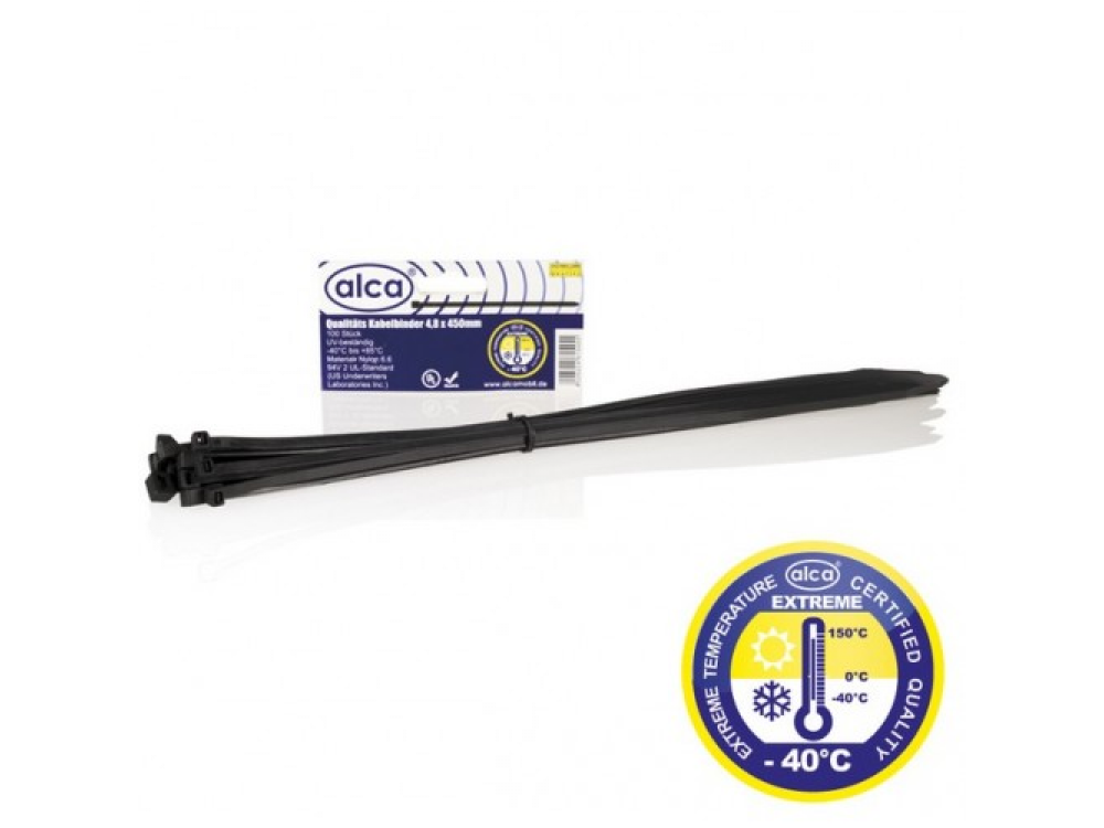 Хомут—стяжка кабельная пластиковая W4.8 L450, цвет черный, 50 шт. в упаковке, температура эксплуатации от — 40 до + 85, материал нейлон, устойчивость к окислению и травлению.