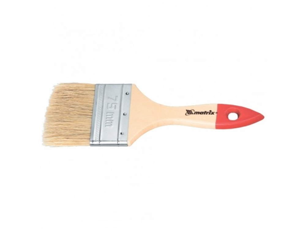 Ворс кисти из натуральной щетины одинарной выварки. Щетина расщеплена на концах. Толщина кисти от 9 до 16 мм. Щетина кисти надежно закреплена металлическим бандажом с антикоррозийным покрытием. Деревянная лакированная ручка утолщена в зоне охвата. Кисть предназначена для работ с масляными красками и лаками.