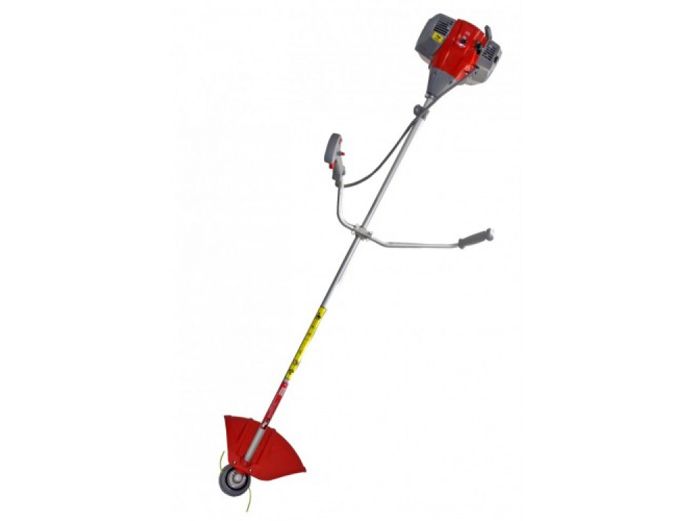 Прямая, неразъемная штанга; велосипедная рукоятка, диск 3х лопастной 255х25,4мм; леска-2,0мм; наплечный ремень.